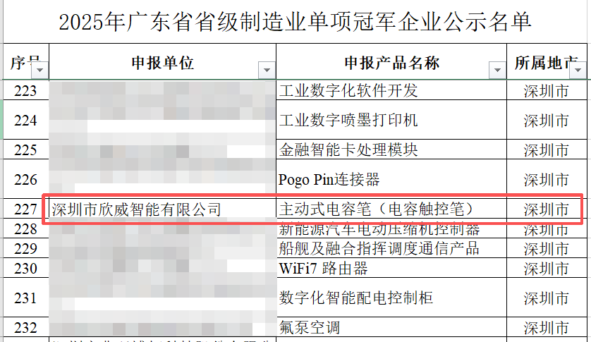 “广东省省级制造业单项冠军”聚焦制造业细分领域排头兵企业,由广东省工信厅组织评选。欣旺达旗下两家企业同步入选:深圳市欣威智能有限公司以其创新设计的“主动式电容笔(电容触控笔)”跻身榜单,另一家专注于新能源锂电池测试评价技术的企业也凭借其深厚的技术积累与专业服务能力成功上榜。值得一提的是,欣旺达此前已获评国家级制造业单项冠军称号,欣旺达动力也曾上榜省级制造业单项冠军,公司在该奖项中已构建起从省级到国家级、覆盖多层面的完整荣誉体系。
